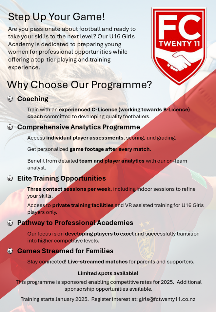 In the meantime, if you have any questions, please contact our Youth and Senior Director of Football, Marius Moeser on 0212370333 or email mariusm@fctwenty11.co.nz